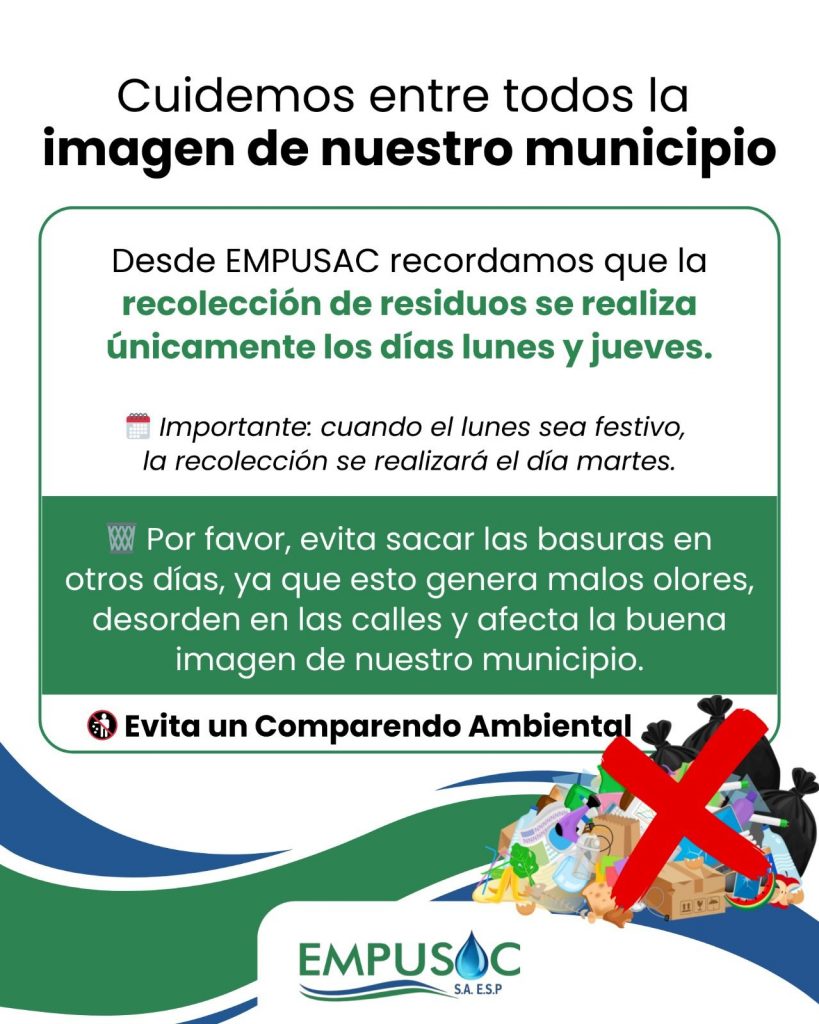 Desde EMPUSAC recordamos a la comunidad que la recolección de residuos se realiza únicamente los días lunes y jueves.⚠️ Cuando el lunes sea festivo, la recolección se realizará el día martes.